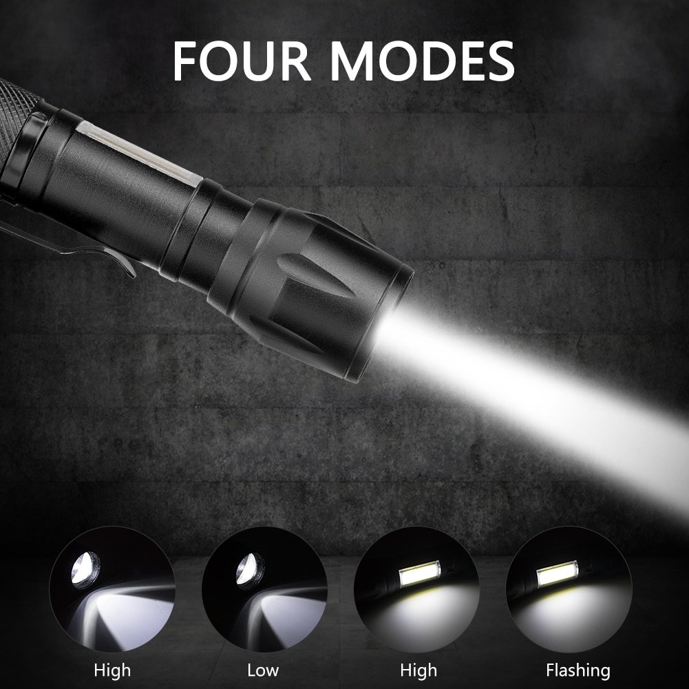 - 3 LED light modes: push button On/Off trigger switch with XPE high light, XPE low light, COB high light